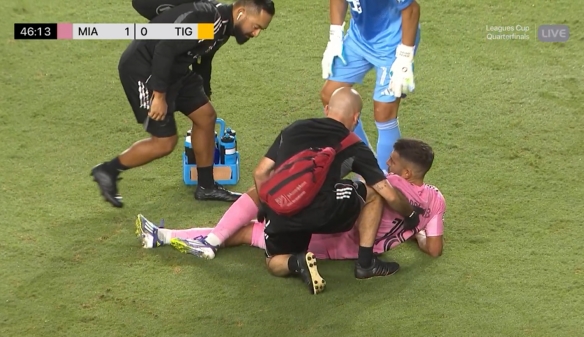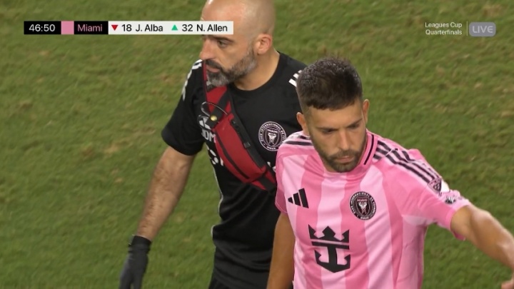 08月21日讯 联盟杯1/4决赛,迈阿密国际迎战老虎大学,上半场尾声阶段,阿尔巴被队友特拉斯科踩到脚踝,下半场坚持上场,但只踢了1分钟又倒地,最终伤退。