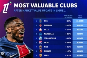 法甲球队身价排行:巴黎10.5亿欧居首,摩纳哥、里尔二三位